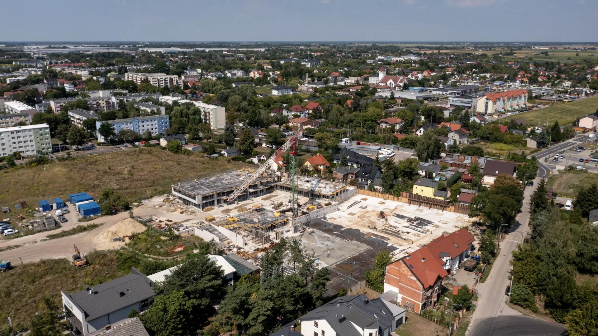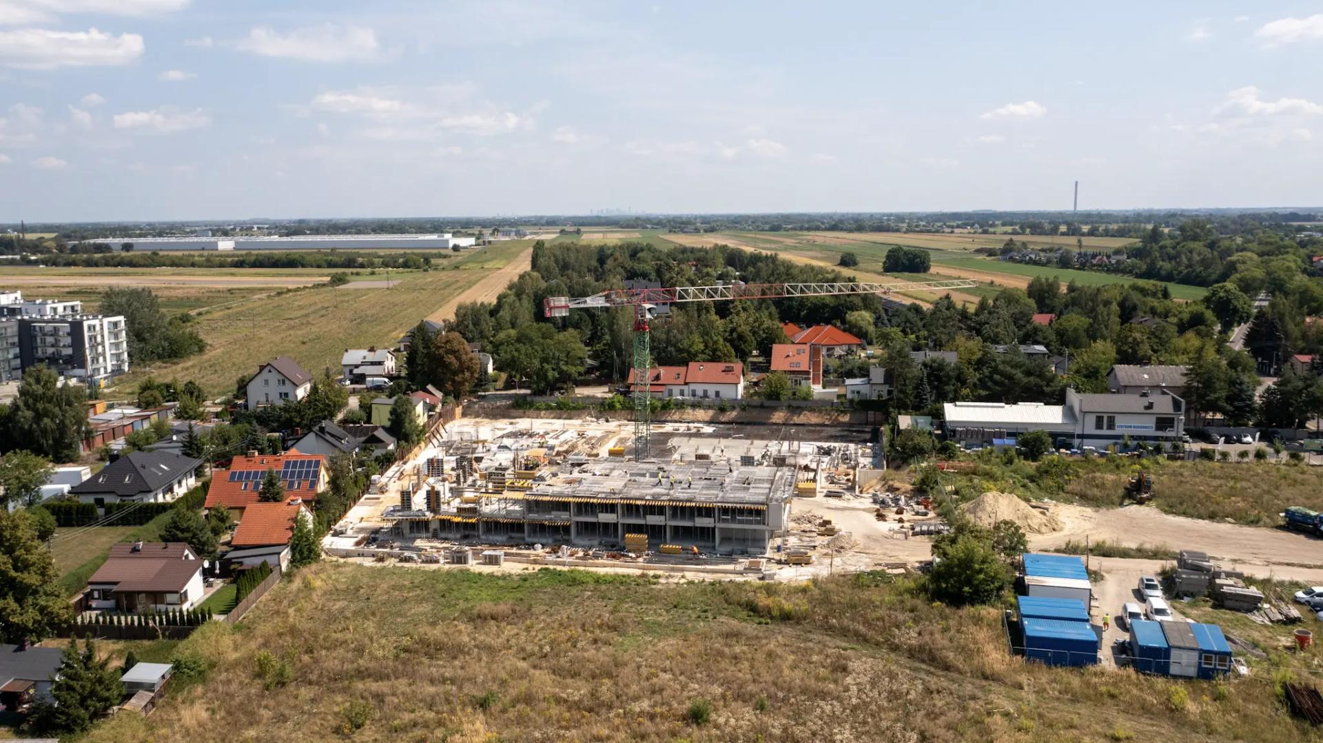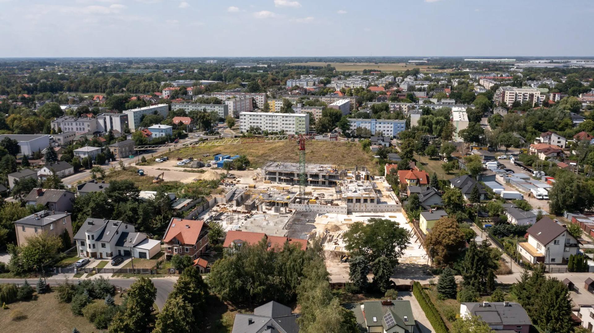 Dobiega końca wznoszenie konstrukcji drugiej kondygnacji budynku A. Postępują prace związane z wykonaniem płyty fundamentowej, ścian podziemia oraz stropu nad garażem w budynku B.