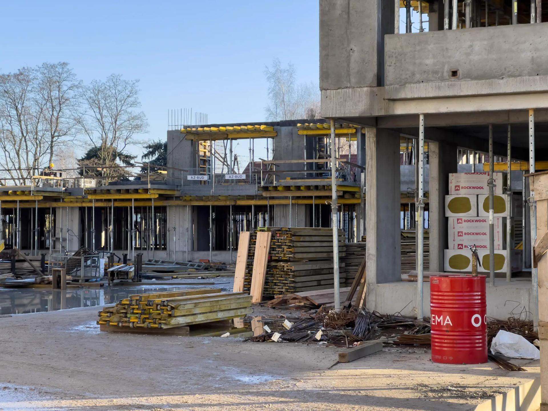 W budynku A rozpoczęto izolowanie balkonów i loggii. Trwa montaż instalacji elektrycznej w lokalach i częściach wspólnych oraz instalacji sanitarnych w garażu. Kontynuowane jest zamurowywanie szachtów instalacyjnych. W budynku B zakończono prace nad stropem parteru, a obecnie trwa wykonanie stropu nad pierwszym piętrem.