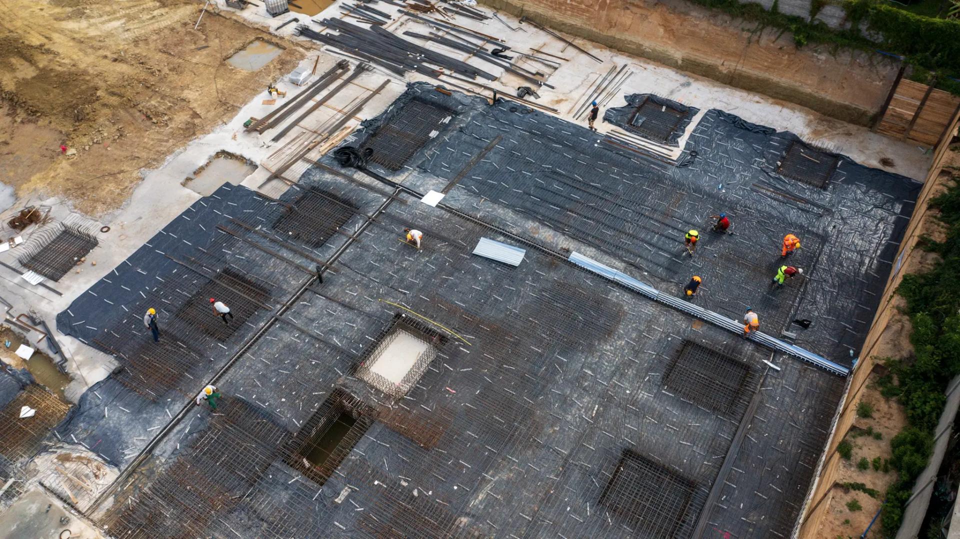 Zakończono roboty ziemne: zasypki, zagęszczenie gruntu oraz stan zero budynku A. Postępują prace związane z wykonaniem konstrukcji kondygnacji pierwszej (parter) budynku A. Trwa betonowanie płyty fundamentowej pod budynkiem B.