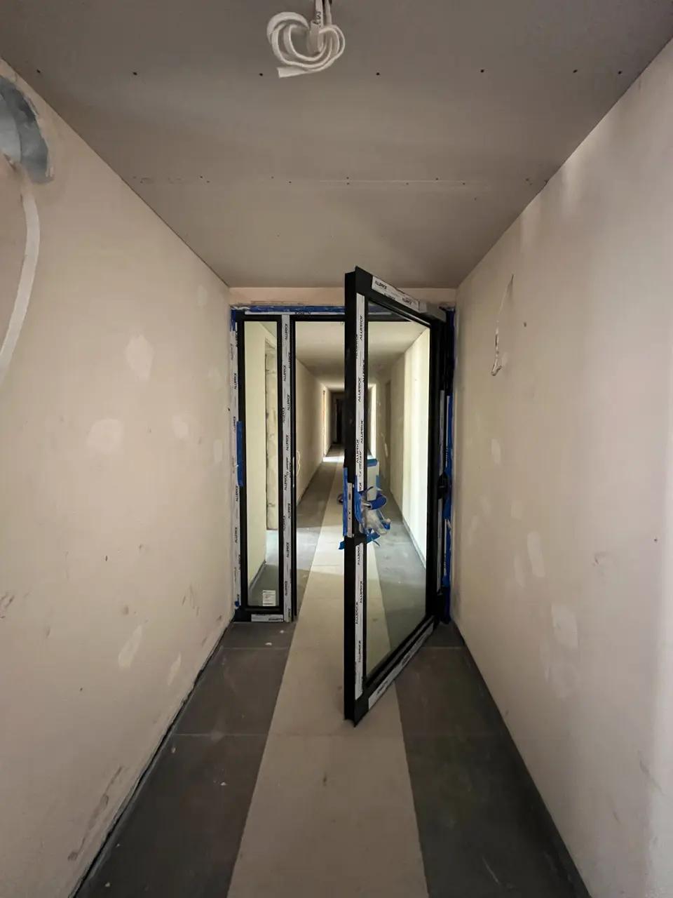 Montujemy już portale drzwiowe oraz boxy w hali garażowej. Położone zostały pierwsze gładzie gipsowe na klatkach schodowych i korytarzach. Trwają prace związane z zagospodarowaniem terenu. Cała powierzchnia garażu została już pokryta żywicą epoksydową.